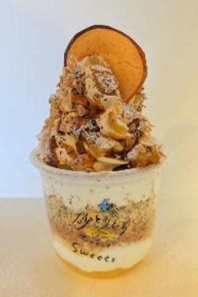 さつまいもアイス・りんごコンポート・りんごゼリー・生クリームを重ねたうえに、さつまいもけんぴ・さつまいもチップ・りんごをトッピング!さわやかな甘みのりんごと、おいもの甘みがマッチしたいまだけの味わいです。