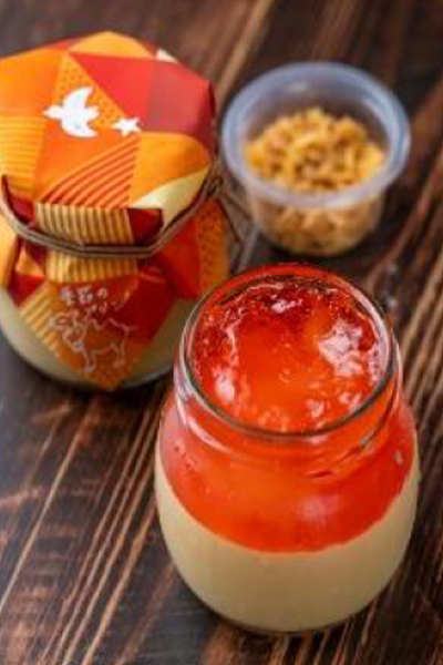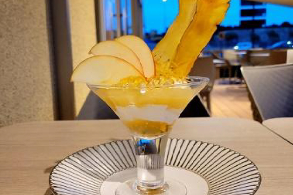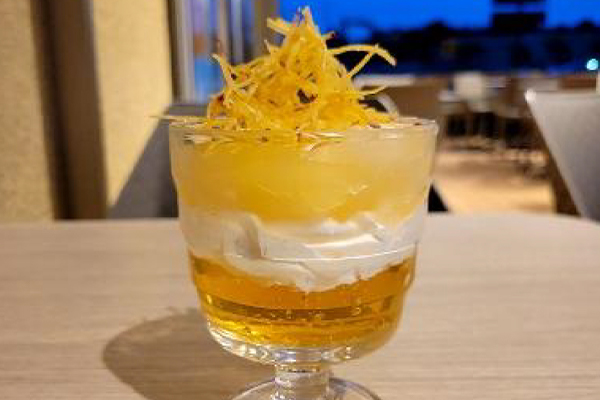 りんごゼリーの上に、生クリーム、りんごコンポート、さつまいものアイスを重ね、さつまいもけんぴをトッピング!お食事と一緒にお楽しみいただけるミニサイズです。