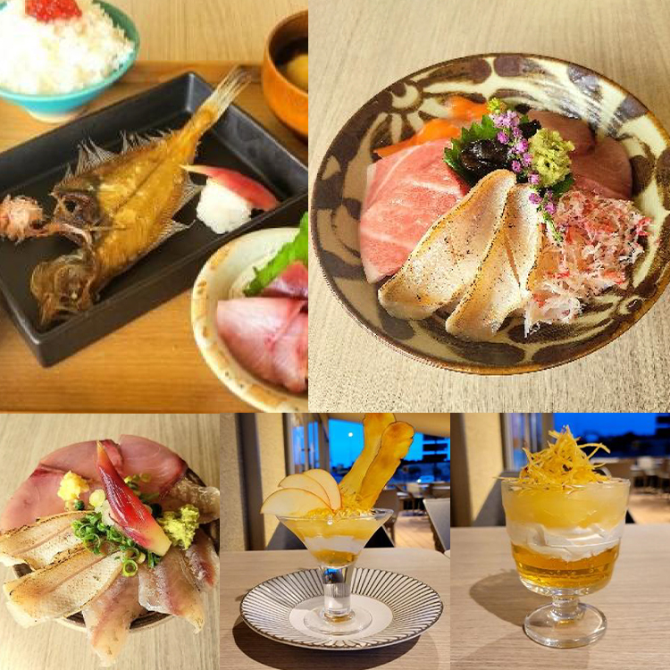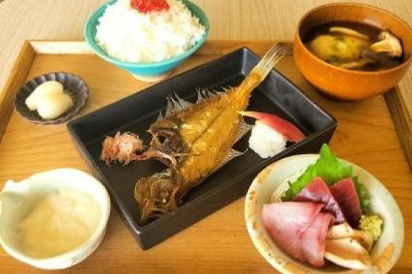 ハダマグロ・のどぐろの炙り・地魚の刺身3種、エテガレイ一夜干し、ねばりっこキノコ汁、らっきょう、すじこ飯など、様々なおいしさを堪能できる定食です。